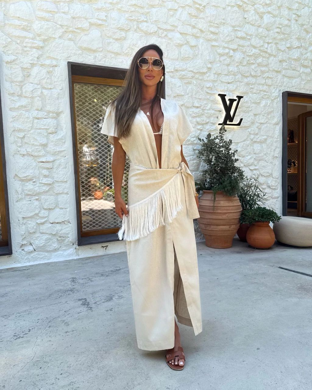 Acompanhando, o poncho em linho com elastano e a saia avulsa com franjas hand-made garantem um visual assimétrico e fashionista, perfeito para ocasiões sofisticadas à beira-mar ou piscina.