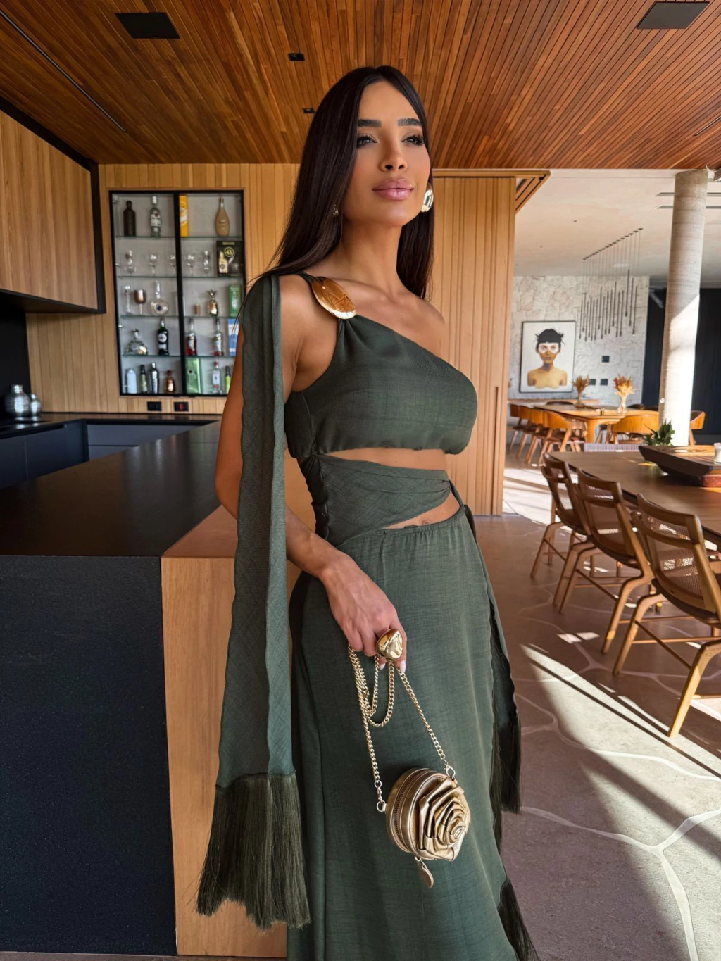 Encante-se com este vestido midi alongado, confeccionado em tecido creponado leve, perfeito para o verão brasileiro. O top assimétrico unilateral sem bojo traz um toque moderno, realçado pelo detalhe em metal dourado no ombro que ilumina o visual. A saia transpassada com franjas hand-made em subotm oferece movimento e fluidez, garantindo conforto e elegância.